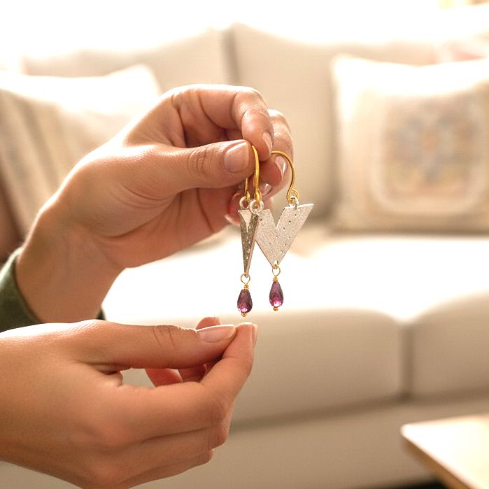 Αυτά τα χειροποίητα σκουλαρίκια αποτελούν μία δημιουργία δίχρωμης σχεδίασης, όπου το επίχρυσο ασήμι συναντά το καθαρό ασήμι σε μια αρμονική σύνθεση. Οι λαμπερές γρανάδες εισάγουν έναν αυθεντικό βίντατζ χαρακτήρα, ενώ η λεπτή επεξεργασία αποκαλύπτει τη δεξιοτεχνία του κατασκευαστή. Μια επένδυση σε κομψότητα που αντέχει στο χρόνο.