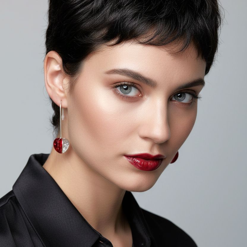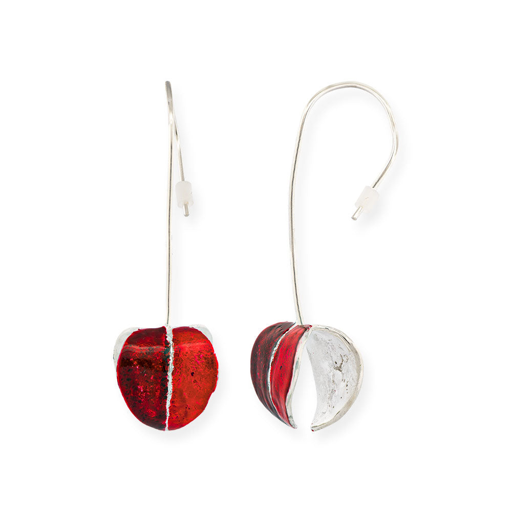 Ζευγάρι σκουλαρίκιων που συνδυάζει τεχνοτροπία και φυσική ομορφιά σε ένα αρμονικό σύνολο. Τα χέρια της δημιουργού έχουν διαμορφώσει ασημένια στοιχεία που περιβάλλουν φύλλα ευκαλύπτου με εντυπωσιακή κόκκινη απόχρωση. Η αντίθεση μεταξύ του ψυχρού μετάλλου και των θερμών τόνων δημιουργεί ένα οπτικό ενδιαφέρον που δεν περνά απαρατήρητο. Κάθε ζευγάρι είναι μοναδικό, ιδανικό για όσους αναζητούν κοσμήματα με προσωπικότητα και καλλιτεχνική αξία.