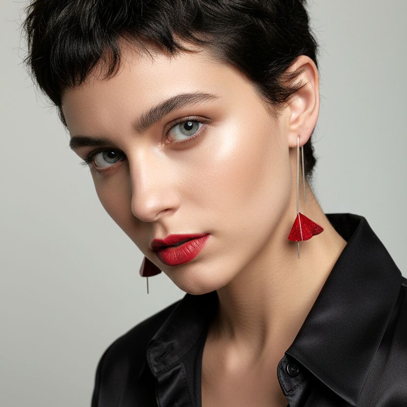 Ένα ιδιαίτερο δημιούργημα που ενσωματώνει την τέχνη της παραδοσιακής χειροτεχνίας με σύγχρονη αισθητική. Τα ασημένια σκουλαρίκια με τις έντονες κόκκινες αποχρώσεις δημιουργούν ένα ολοκληρωμένο σύνολο που προσελκύει τα βλέμματα. Η λεπτή επεξεργασία κάθε λεπτομέρειας αποδεικνύει την αφοσίωση του δημιουργού στην τελειότητα. Ένα κόσμημα που μιλά για την προσωπικότητα και τον εκλεκτικό γούστο όσων το φορούν.
