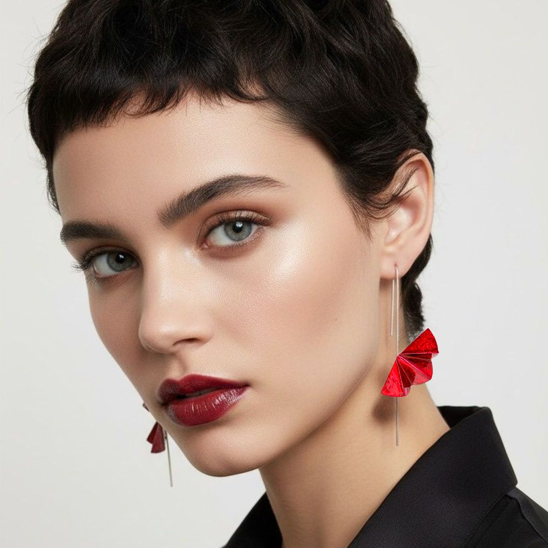 Ένα ιδιαίτερο δημιούργημα που ενσωματώνει την τέχνη της παραδοσιακής χειροτεχνίας με σύγχρονη αισθητική. Τα ασημένια σκουλαρίκια με το γεωμετρικό μοτίβο βεντάλιας και τις έντονες κόκκινες αποχρώσεις δημιουργούν ένα ολοκληρωμένο σύνολο που προσελκύει τα βλέμματα. Η λεπτή επεξεργασία κάθε λεπτομέρειας αποδεικνύει την αφοσίωση του δημιουργού στην τελειότητα. Ένα κόσμημα που μιλά για την προσωπικότητα και τον εκλεκτικό γούστο όσων το φορούν.