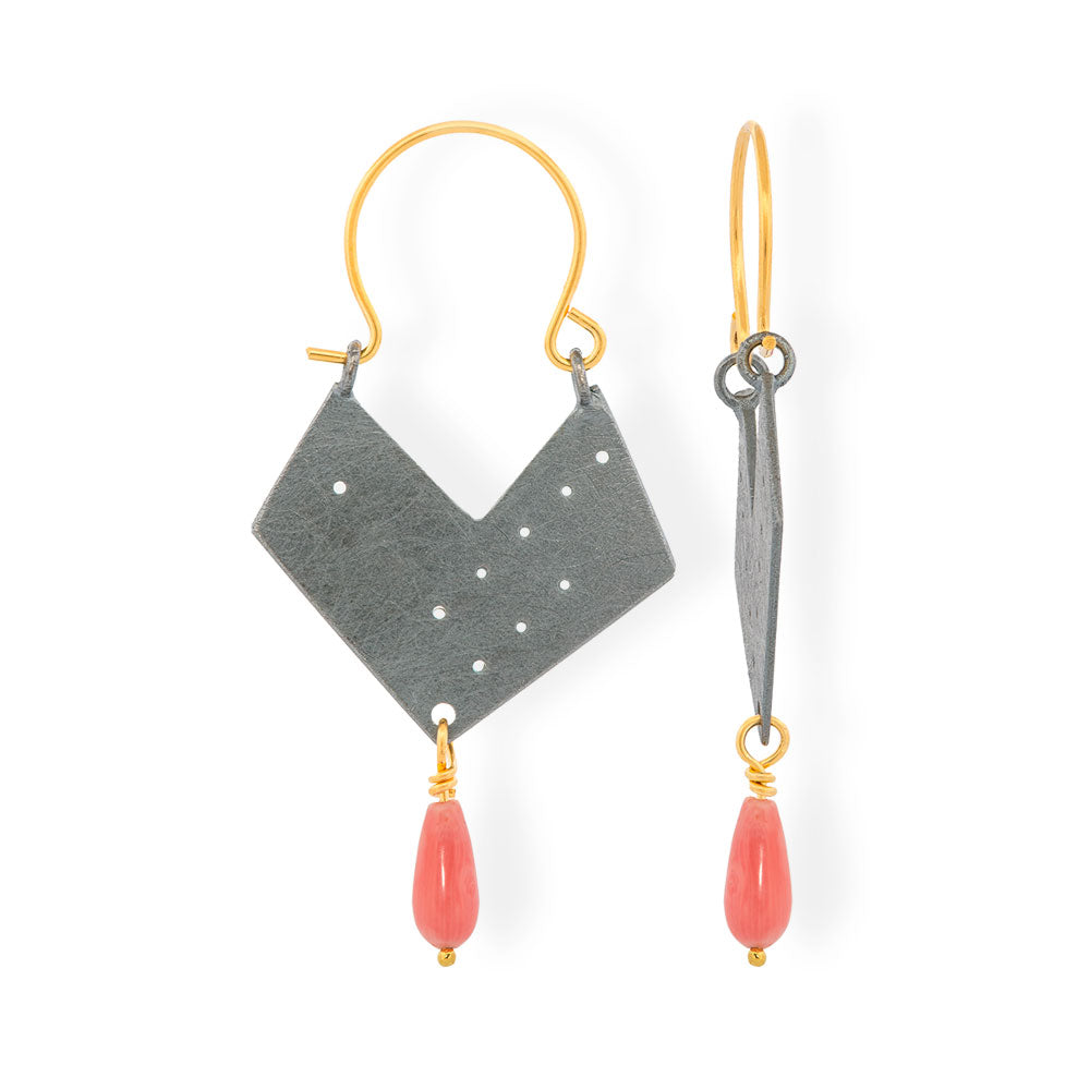 Questi orecchini rappresentano un'eccellente fusione tra design geometrico contemporaneo e artigianalità raffinata. Realizzati a mano in argento sterling con placcatura oro e nero, ogni pezzo cattura l'attenzione grazie al contrasto cromatico sofisticato. I coralli naturali aggiungono profondità e carattere unico a questi gioielli esclusivi. La costruzione geometrica precisa garantisce un'estetica moderna, mentre la lavorazione artigianale assicura che nessun paio sia identico all'altro. Una scelta ideale per chi apprezza l'unicità e la qualità senza compromessi.